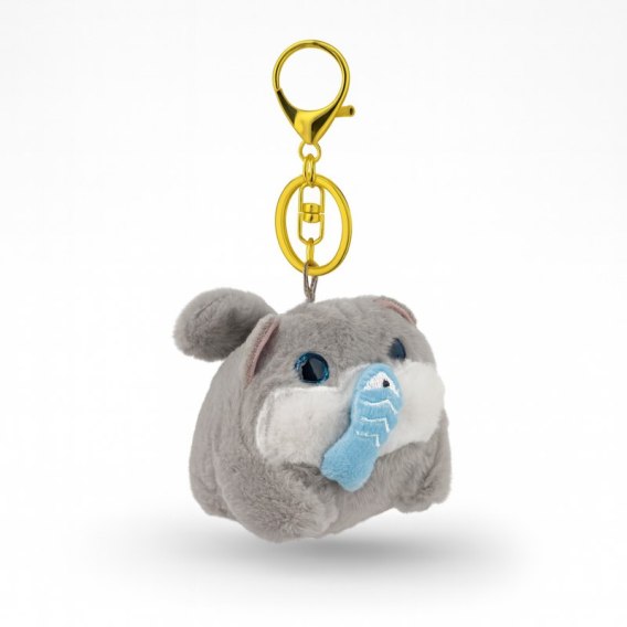 Brelok do kluczy - Kot łapiący rybę z kręconym ogonkiem, szary BRL398SZ