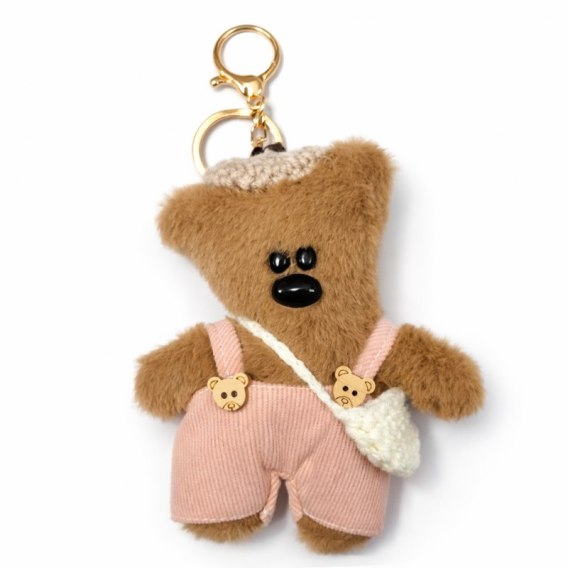 Brelok do kluczy, pluszowy brązowy miś w ogrodniczkach i berecie, róż BRL402R