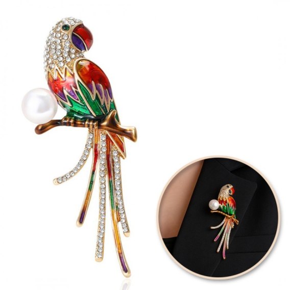 Broszka ozdobna - papuga z cyrkoniami i perłą BZ221