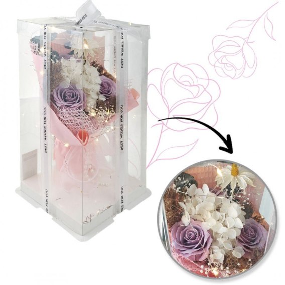 - Możliwość włączania i wyłączania lampek. Materiał: kwiaty mydlane / opakowanie z tworzywa sztucznego. Wymiary: