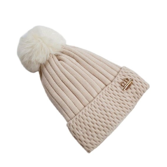 Czapka zimowa dzianinowa z pomponem i naszywką, kremowa CZ33WZ1