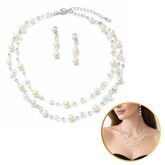 Delikatny zestaw ślubny z perłami i kryształkami, naszyjnik oraz kolczyki N1073
