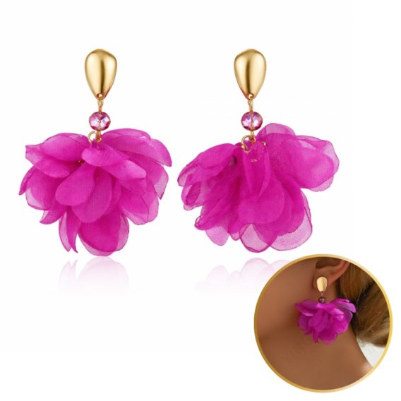 Kolczyki wiszące, efektowne tiulowe z kryształkami, fuksja złote sztyft K1723F