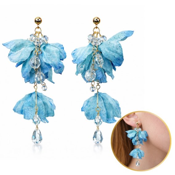 Kolczyki wiszące, efektowne tiulowe z kryształkami, niebieskie ombre sztyft K1729