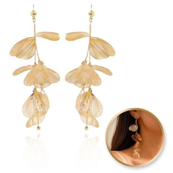 Kolczyki wiszące tiulowe złote efektowne kwiaty 5x12cm K1678