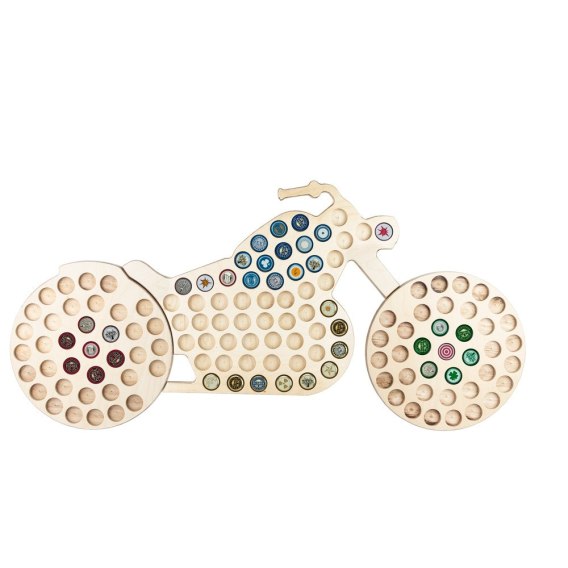 Solidny drewniany motocykl na kolekcję kapsli od piwa.