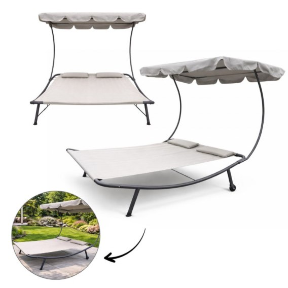 Leżak ogrodowy dwuosobowy z baldachimem Szary leżak idealnie sprawdzi się w ogrodzie, na balkonie czy na basenie.