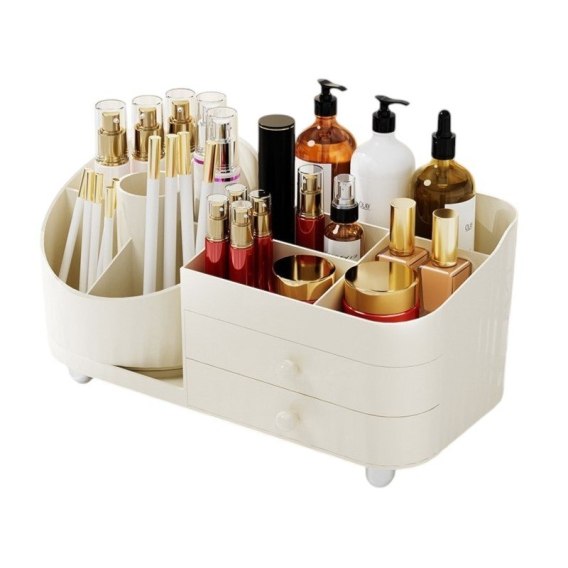 Organizer na pędzle, kosmetyki, obrotowy z szufladkami, kremowy 31 x 14,5 x 11,6 cm CB66