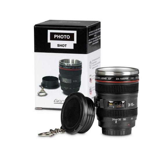 Photo Shot - kieliszek obiektyw to gadżet, który uczyni z Ciebie najpopularniejszego i najlepiej zaopatrzonego fotografa w mieście. To niewielki kieliszek, który jest dokładną miniaturą obiektywu fotograficznego! Wystarczy mieć go zawsze przy sobie i szukać ciekawych okazji…