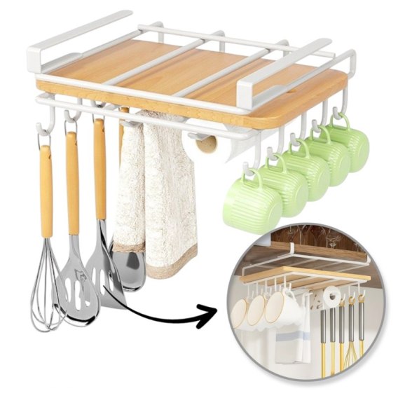 Półka, uchwyt podwieszany do szafki, organizer kuchenny z haczykami, biały OR116B