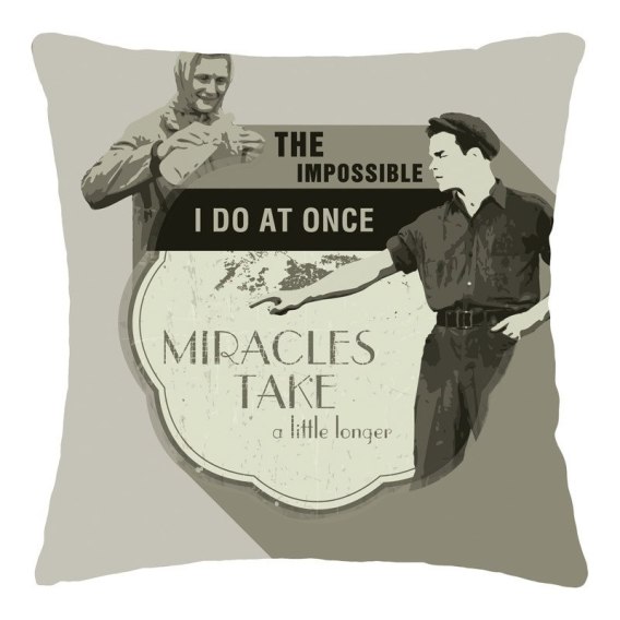 Nie od dziś wiadomo, że najlepszy sposób, żeby coś osiągnąć, to ogłosić to światu. Dlatego jeśli marzysz o dokonywaniu w swoim życiu cudów, musisz zaopatrzyć się w poszewkę na poduszkę, która Cię do tego zmotywuje! Znajdujący się na niej napis "The impossible I do at once, miracles take a little longer" wręcz zmusi Cię do podejmowania godnych pozazdroszczenia wyzwań, a do tego sprawi, że każdy dzień zaczniesz w świetnym humorze!