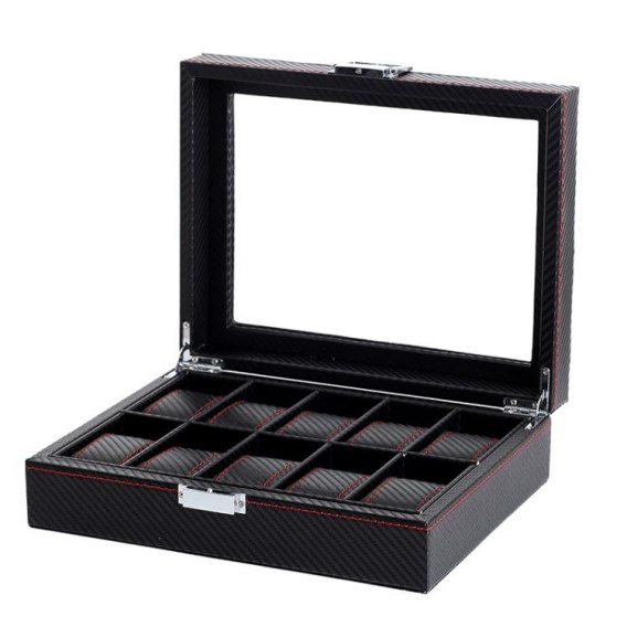 Szkatułka pudełko na zegarki na 10szt Karbon czarny, przeszycia 28 x 22 x 8cm PD136