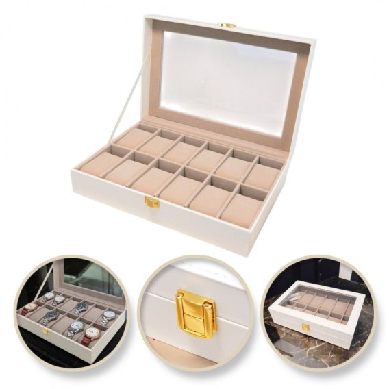 Szkatułka pudełko na zegarki na 12szt, biała ekoskóra 30 x 20 x 8cm PD154