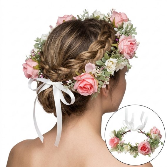 Romantyczny wianek na głowę z wysokiej jakości kwiatów sztucznych.