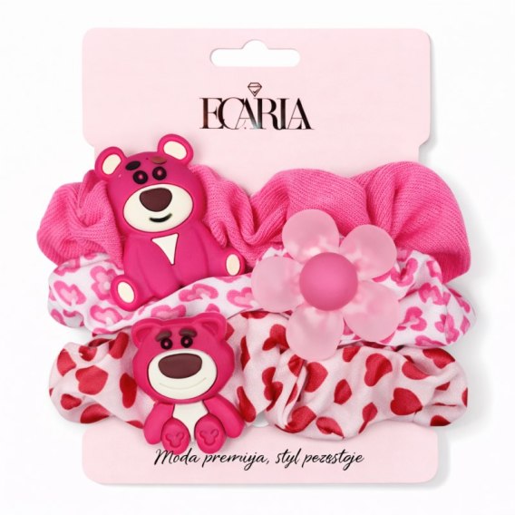 Zestaw frotek gumek 3w1 na plakietce, różowe misie, kwiat GUM190