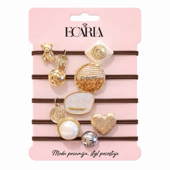 Zestaw frotek gumek 5w1 na plakietce, brązowe z kamieniami, złote SERCE GUM184