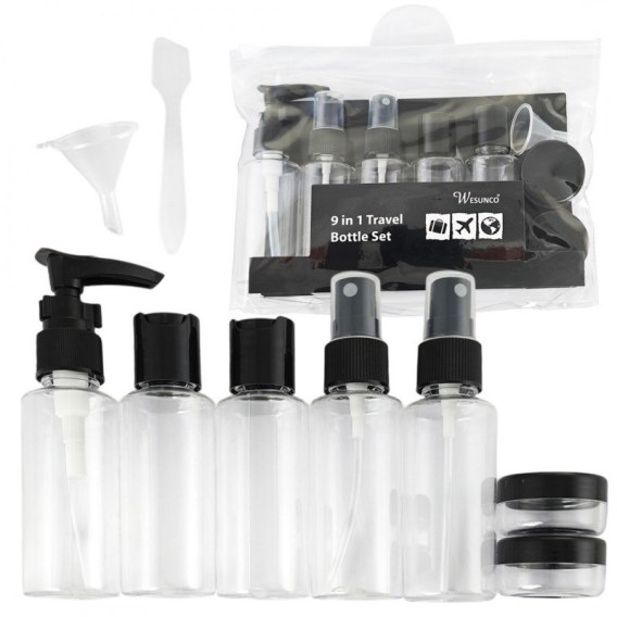 9-częściowy zestaw buteleczek i pojemniczków, specjalnie zaprojektowanych do przewożenia kosmetyków w podróży.